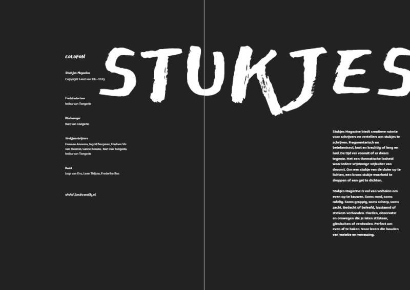 Stukjes Magazine biedt een creatieve ruimte voor schrijvers en vertellers om stukjes te schrijven. Fragmentarisch en betekenisvol, kort en krachtig of lang en luid. De tijd ver vooruit of er dwars tegenin. Met een thematische losheid waar iedere vrijzinnige vrijbuiter van droomt. Om een stukje van de sluier op te lichten, een broos stukje waarheid te droppen of een gat te dichten.